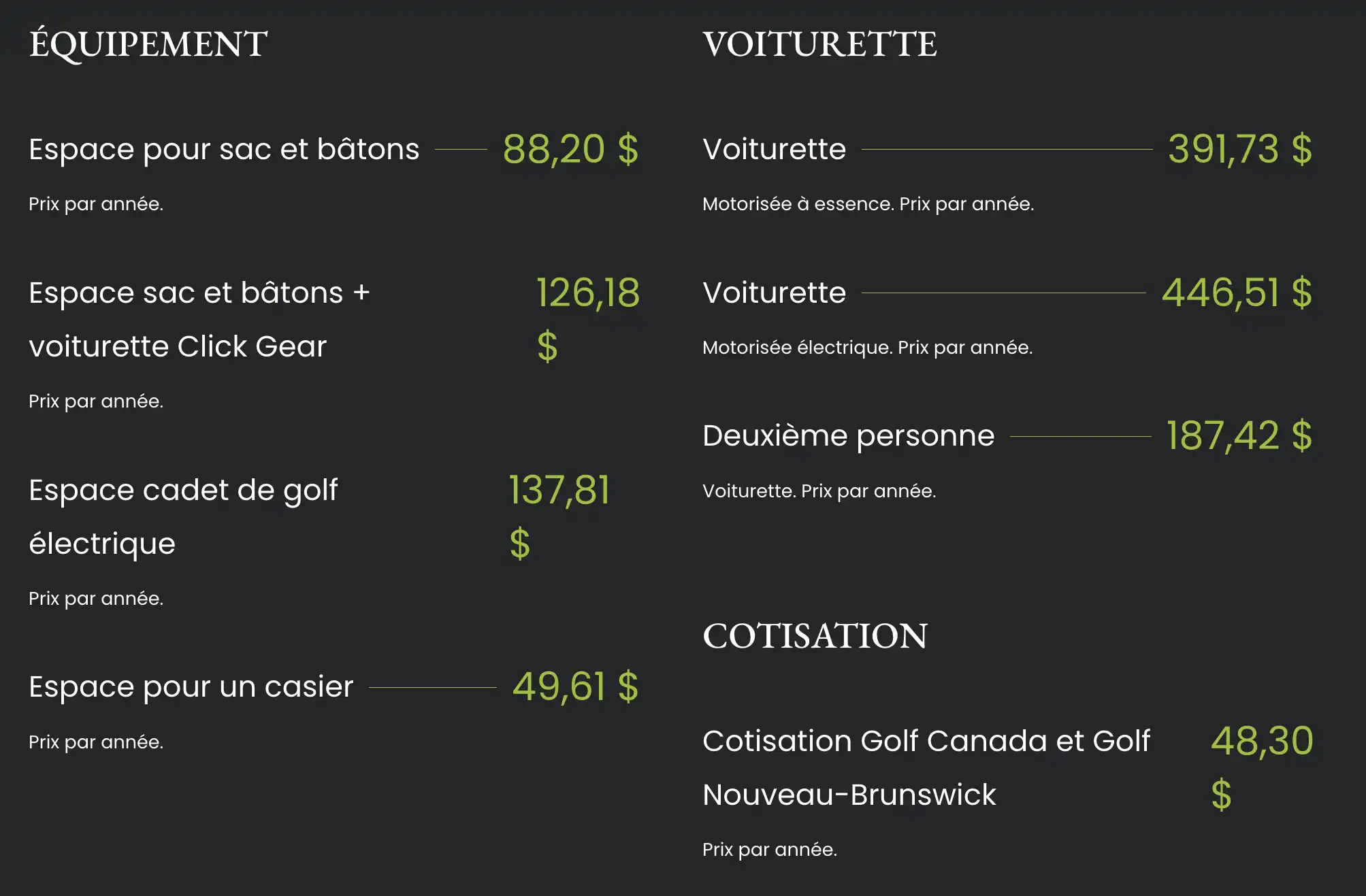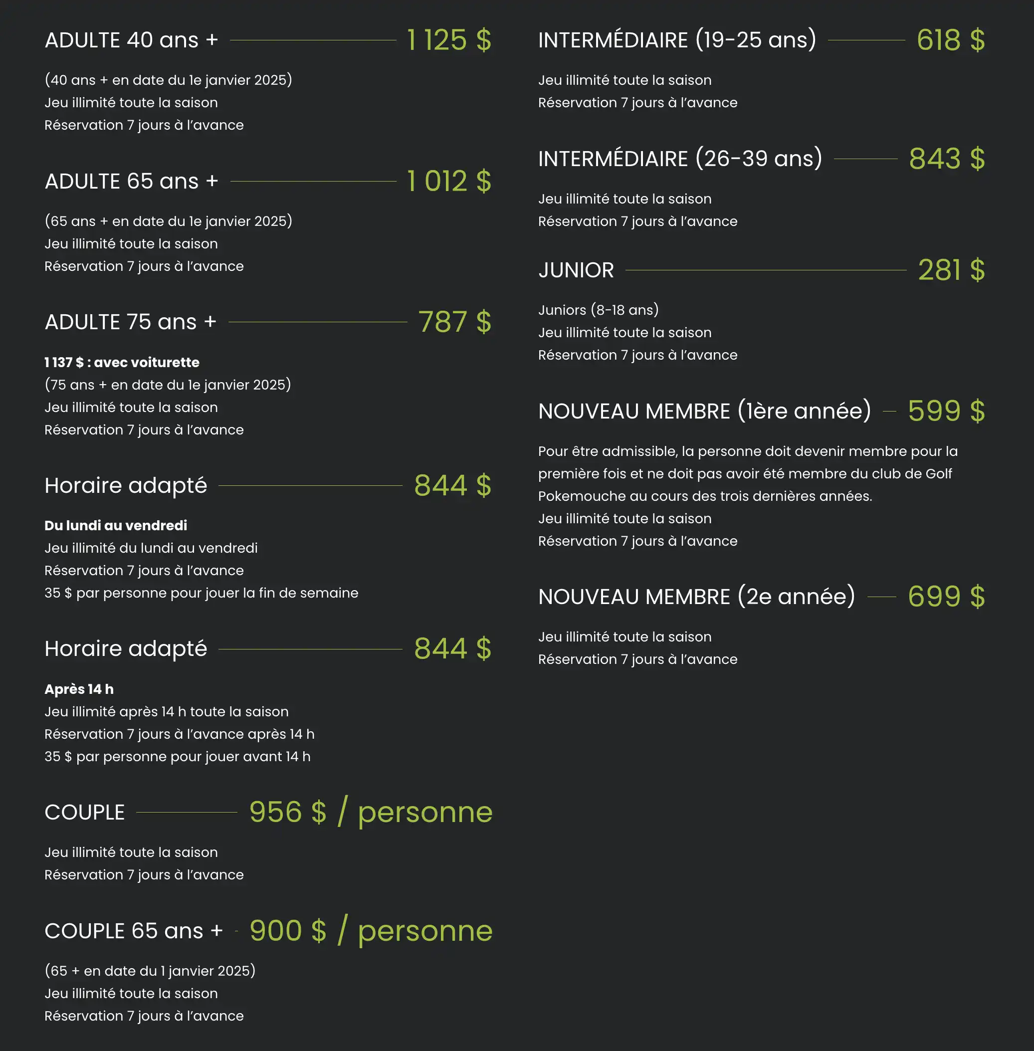 Les membres du club de Golf Pokemouche ont droit aux privilèges suivants :